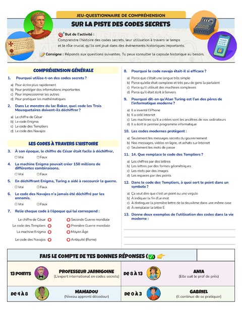 Ce jeu-questionnaire de compréhension permet aux élèves de consolider ce qu’ils ont découvert dans la capsule historique sur les codes. À travers des questions variées — choix multiples, vrai ou faux, associations et réflexion — ils revisitent les grandes étapes de l’histoire des messages secrets, de Jules César à aujourd’hui.