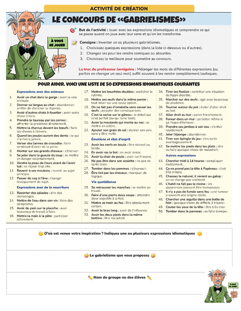 Le concours de gabrielismes propose aux élèves de faire exactement ça, mais en comprenant d’abord comment fonctionne l’expression originale . À partir d’une banque d’expressions idiomatiques, ils doivent en transformer une, en modifier un mot ou en fusionner deux, puis soumettre leur meilleure création au vote.