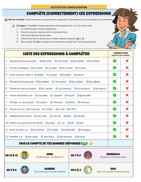 Les élèves sont amenés à réfléchir au sens, à comparer les propositions et à identifier l’expression exacte. Un excellent moyen de renforcer la compréhension du sens figuré et la précision du vocabulaire, tout en s’amusant.