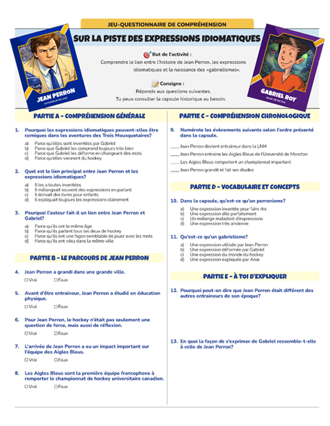 Ctte activité permet de consolider la compréhension de la capsule De Jean Perron à Gabriel Roy à travers un jeu-questionnaire structuré et progressif.
