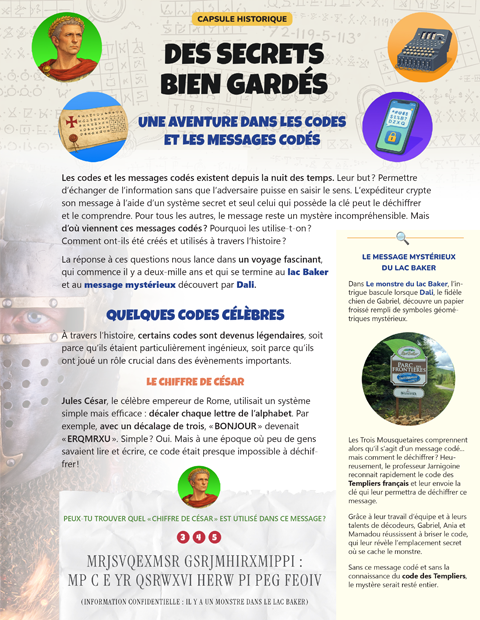 À partir du message mystérieux découvert dans Le monstre du lac Baker, les élèves explorent le rôle des codes à différentes époques, découvrent comment ils ont protégé des secrets, influencé des guerres et même contribué à la naissance de l’informatique moderne.