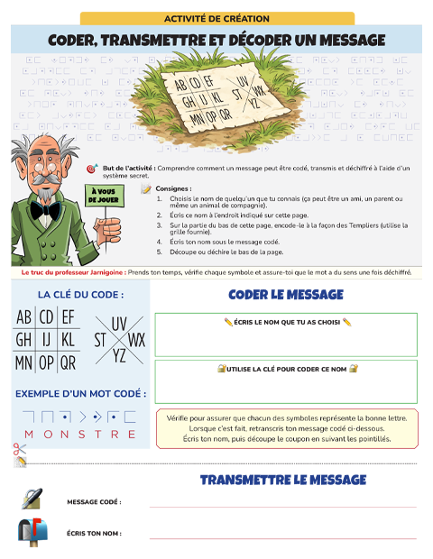 Après avoir découvert l’importance des codes dans l’histoire et dans le roman, ils conçoivent leur propre message secret à l’aide d’un système inspiré des Templiers. Ils apprennent ainsi à coder, vérifier, transmettre et déchiffrer un message en respectant une clé précise.